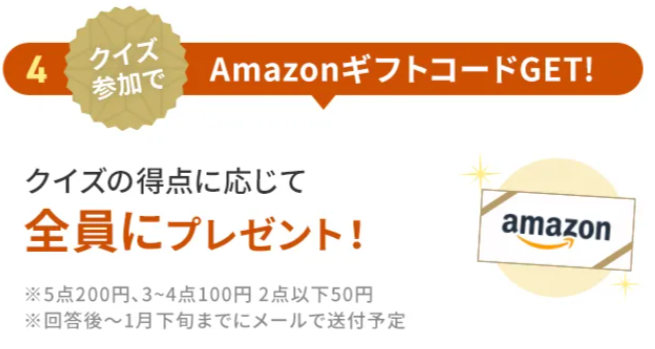 クイズに答えた人全員、最大200円分のアマギフもらえるよ!